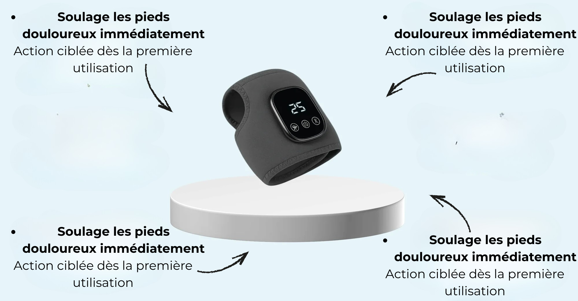 Entre le travail en talons et mes sessions de course, mes pieds me faisaient vraiment souffrir. J'ai essayé cet appareil un peu au hasard... Honnêtement bluffée ! En 10 jours ma douleur a nettement diminué. Je peux enfin porter mes talons aiguilles sans grimacer.