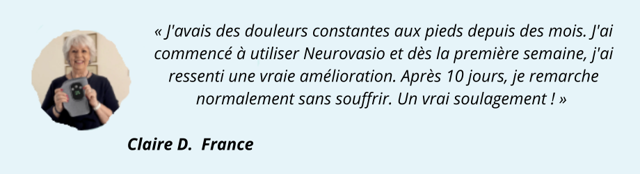 Je ressentais souvent des douleurs aux pieds après mes journées de travail. Depuis que j'utilise le Neurovasio, tout est beaucoup plus supportable. Je me sens vraiment soulagée.